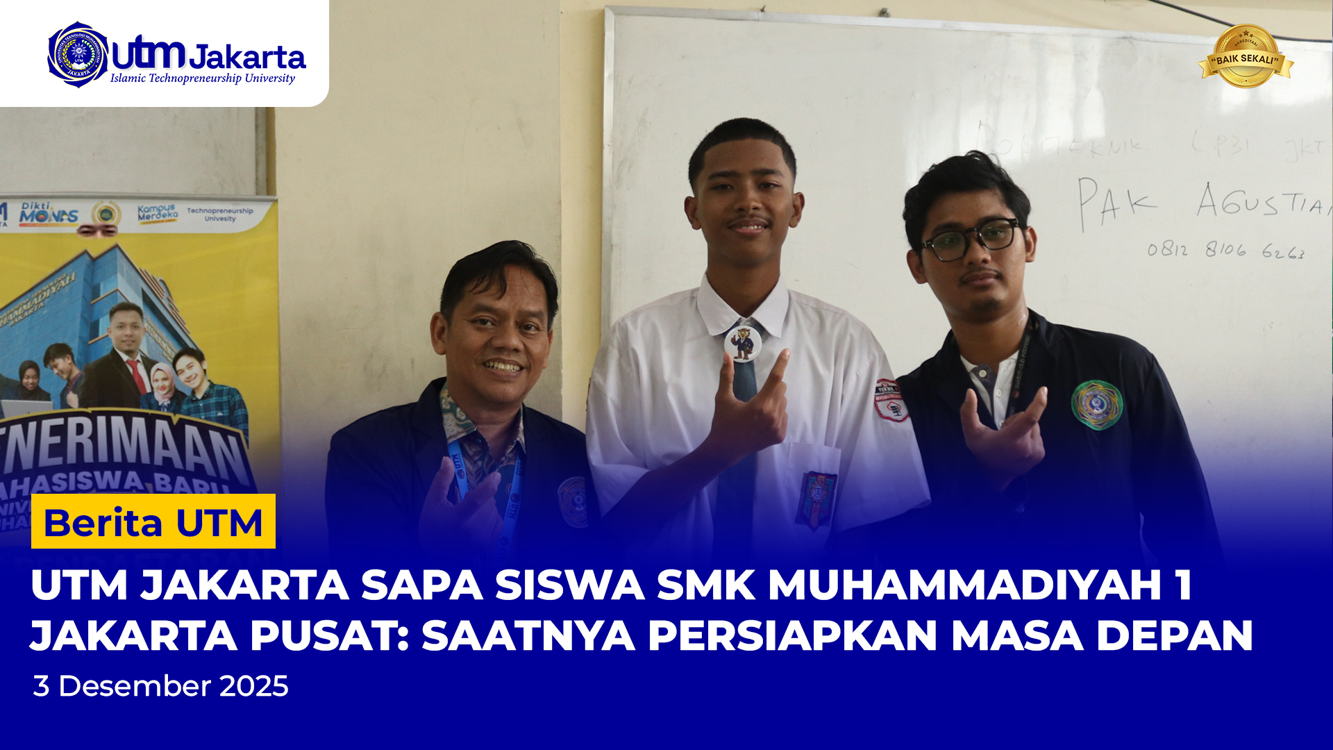 Jakarta, 3 Desember 2025 – Menjelang tahun ajaran baru 2026/2027, Universitas Teknologi Muhammadiyah Jakarta (UTM Jakarta) mengadakan promosi ke SMK Muhammadiyah 1, Kemayoran, Jakarta Pusat pada hari Rabu, 3 Desember 2025. Kegiatan ini diikuti oleh Kabag Marketing, Syafrul, SE, MM, Mahasiswa Manajemen UTM Jakarta, dan Dosen UTM Jakarta. Promosi ini menjadi bagian dari proses penerimaan mahasiswa baru di tahun ajaran 2026/2027.